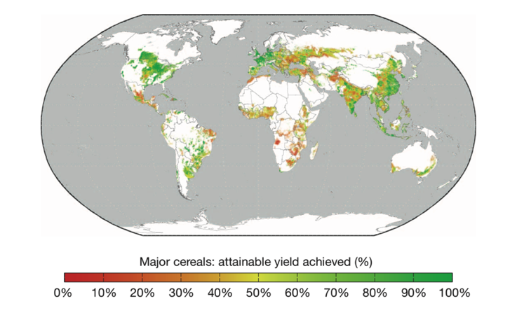 This figure from the Mueller et al. (2012) reading of Class 5 illustrates global yield gaps for staple grains (maize, wheat, and rice) ca. 2000. The pixels of this gridded map show the ratios (in percent) of the weighted average observed staple grain yields to the corresponding attainable yield values. The attainable yield (or yield potential) for each pixel is obtained by averaging 95 percentile yields in all pixels that have similar climates (annual precipitation and growing degree days) but may have different fertilizer and irrigation inputs. An average-to-attainable ratio of 100% in a given pixel indicates that the yield gap there is zero. Ratios less than 100% indicate non-zero yield gaps.