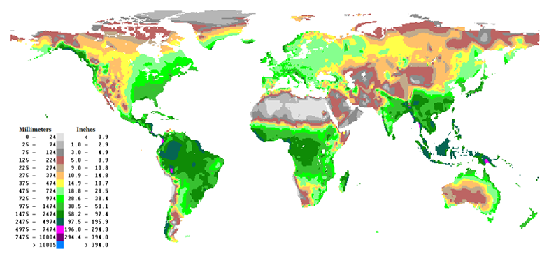 Note the relatively high annual rainfall in temperate mid-latitude areas of Europe and North and South America and in much of the tropics.