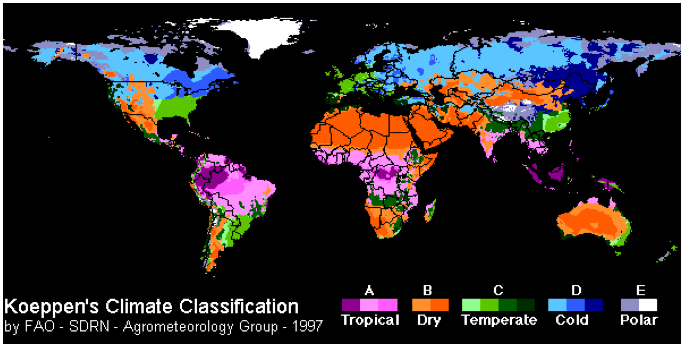 Figure S8.1 Köppen global climate classification, 1997.Source: FAO Climate impact on agriculture program