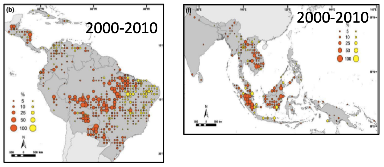 These figures from Achard et al. (2002) show that the lost forest area in some areas of the Amazon and southeast Asia was up to 50% of total forested land over one decade, 2000–2010. The gross loss of forest cover appears in orange circles while gross loss from other woodland areas appears in yellow circles. The range is 0–100% loss over the decade, indicated by the size of the circles.