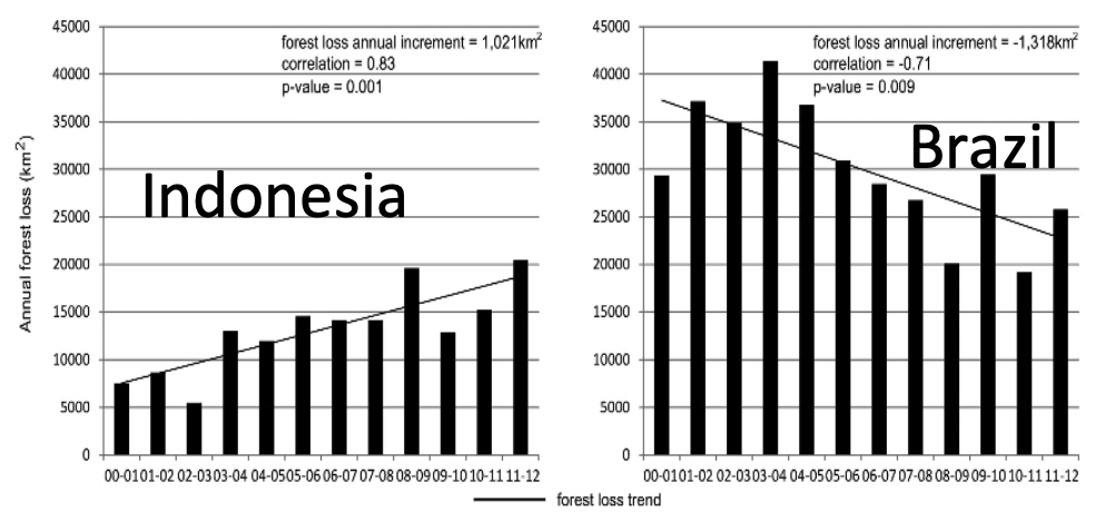 The following charts from Hansen et al. (2013) give estimated annual forest loss totals for Brazil and Indonesia from 2000 to 2012. The annual forest loss increment is the slope of the estimated trend line in each chart. Although Brazil’s losses decreased over the plotted period, they are still substantial. Tropical forest loss rates change substantially over time, depending on government policies. It is likely that Brazil’s rates increased at times after 2012.
