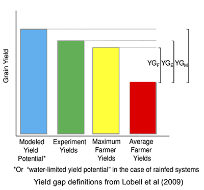 The Lobell et al. survey of observed yield gaps indicates that average farmer yields range from only 20% of irrigated yield potential for rainfed maize in Africa to nearly 80% or higher for wheat and rice in irrigated areas with adequate nutrient application and good pest control. The authors’ list of factors responsible for yield gaps include stresses related to imperfect nutrient and water applications, planting practices, and seed quality, as well as pests, storm damage, and soil deficiencies. It is difficult to identify which factors predominate in a given location and season. The data presented in the paper show the large variability in yield observed even in relatively homogeneous regions such as the US corn belt. This variability does not seem to be explained primarily by farmer decisions but, rather, reflects the ever-changing aggregate effect of all the management and environmental factors listed above.