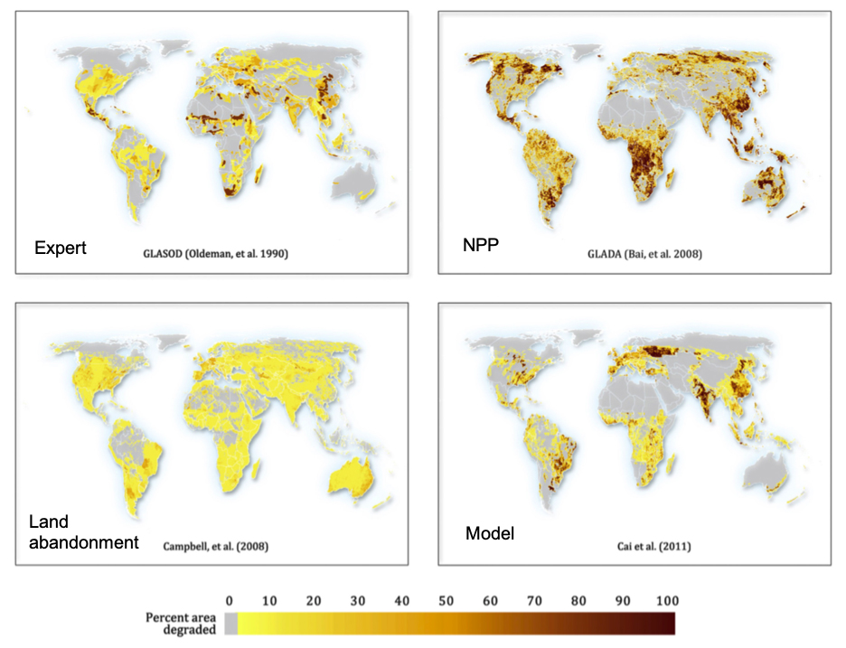 Figure S9.2: Four different estimates of global soil degradation with a common color scale (percent of land