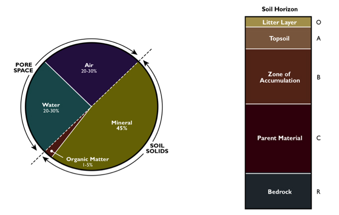 Soil is comprised of inorganic minerals, organic matter, water, and air. It typically forms in layers (or soil horizons) when it develops from the weathering and transport of mineral or organic parent material (Figure S9.1).