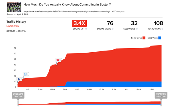 Our goals are to increase ridership among our specified market by 10% over YTD performance. For this experiment which has some limitations – namely that we’re not actually Hubway, that we’re using BuzzFeed’s community sharing profile as opposed to its viral advertising and don’t actually have BuzzFeed support, we’d like to have 500 views/clicks over the week in which we launched the quiz with a 50% completion rate. To date we have a total of 108 views.