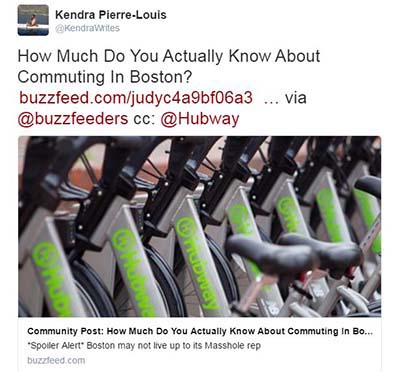 Kendra’s tweet, tagging BuzzFeed and Hubway.
