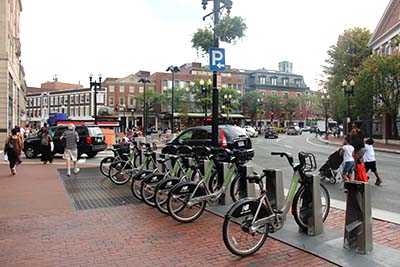Several modes of transportation - walking, bike share, personal cars, and a subway stop - in Harvard Square. (Courtesy of Connie on Flickr. License CC BY-NC-SA.)